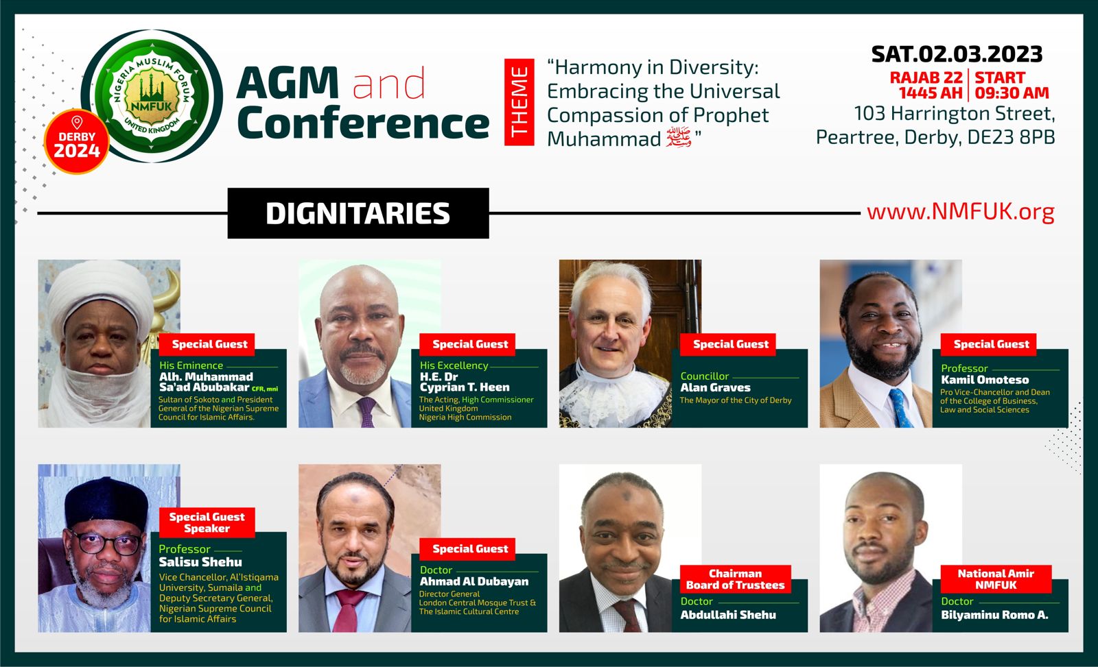 The Nigeria Muslim Forum UK (NMFUK) is excited to announce its 2024 Annual General Meeting (AGM) and Conference, set to take place on Saturday, 3rd February, at 103 Harrington Street, Peartree, Derby, DE23 8PB. This year's theme, "Harmony in Diversity: Embracing the Universal Compassion of Prophet Muhammad," promises to offer profound insights into the unifying teachings of Prophet Muhammad and their relevance in today's diverse society.